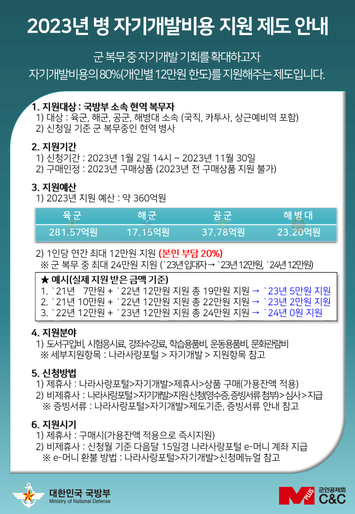 - 군 복무 중 자기 계발 기회를 확대하고자 자기 개발지용의 80%(개인별 80%( 1212만 원 한도)를