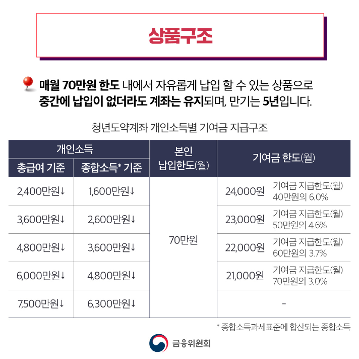 - 만기 5년(만기 시 정부기여금 지원, 이자소득 비과세)