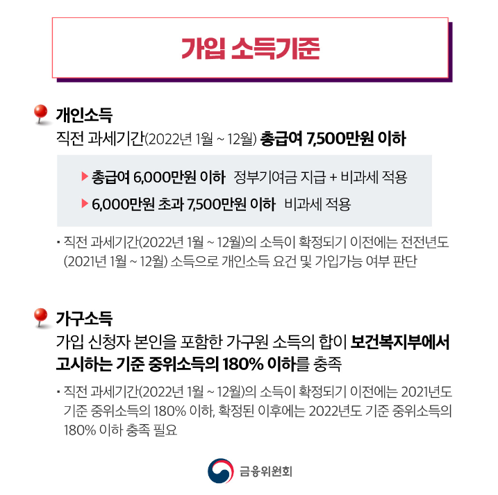 - 개인소득: 직전 과세기간 총 급여 7,500만 원 이하