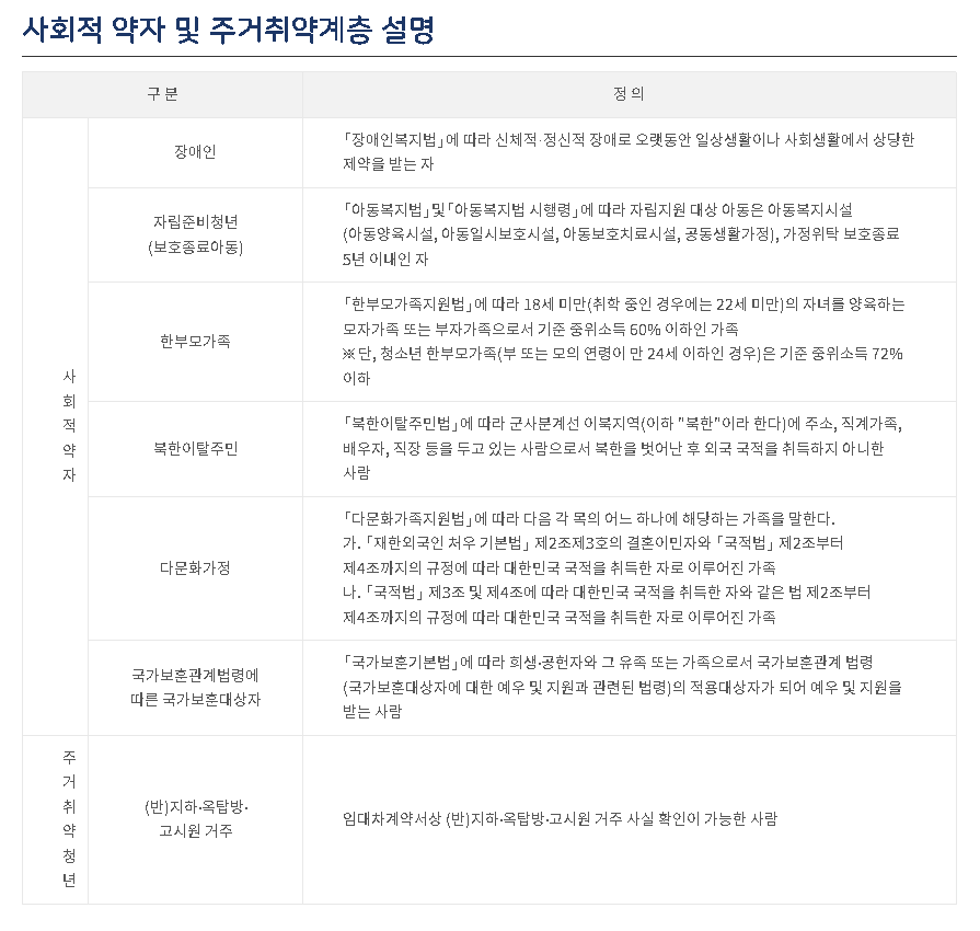 - 사회적 약자 : 장애인, 자립준비청년(보호종료아동), 한부모 가족, 북한이탈주민, 다문화가정,